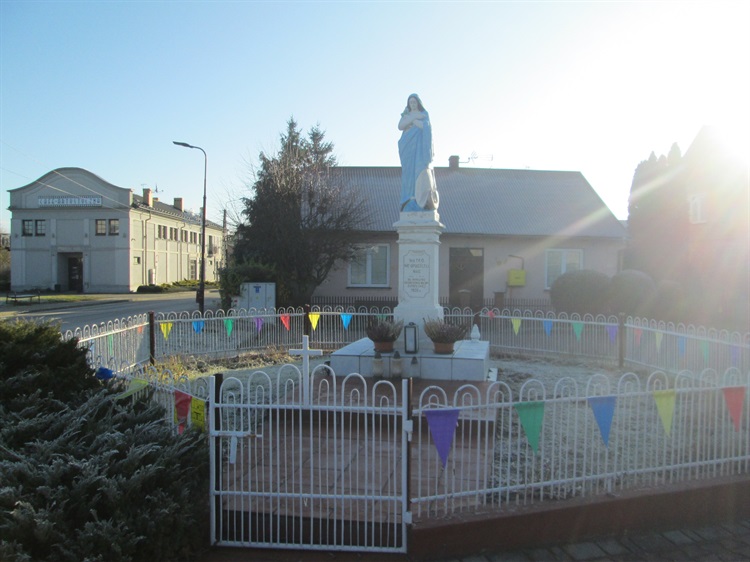 Figura Matki Bożej znajduje się na skrzyżowaniu ulic Tadeusza Kościuszki i Partyzantów. Ufundowana została na pamiątkę ukończenia wojny w 1920 roku. Przedstawia Matkę Bożą w biało turkusowej sukni na wysokim białym cokole.