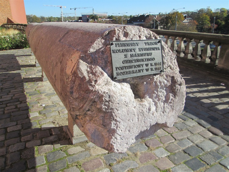 Fragmenty Kolumny Zygmunta wyeksponowane są przy Zamku Królewskim od strony Alei Solidarności. Pierwszy trzon kolumny z marmuru chęcińskiego pochodzi z lat 1644-1887, natomiast drugi z różowego granitu włoskiego z lat 1887-1944.