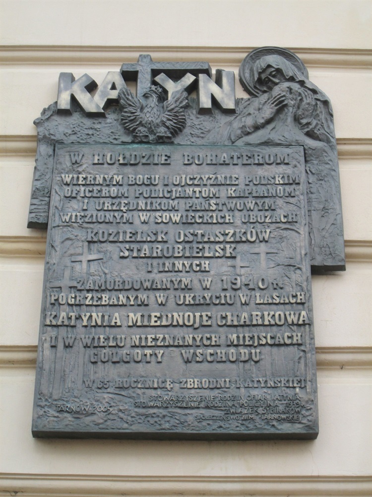 Tablica upamiętniająca ofiary Katynia, Miednoje, Charkowa znajduje się przy ulicy Wałowej, na ścianie bocznej budynku od strony Placu Ofiar Katynia. Ufundowana została w 2005 roku, w 65-rocznicę zbrodni katyńskiej. Powstała według projektu Ewy Fleszar. Oprócz napisu pamiątkowego pod literą T wydłużoną w formie krzyża w napisie Katyń umieszczono orła w koronie, natomiast po prawej stronie wizerunek Matki Boskiej Katyńskiej.