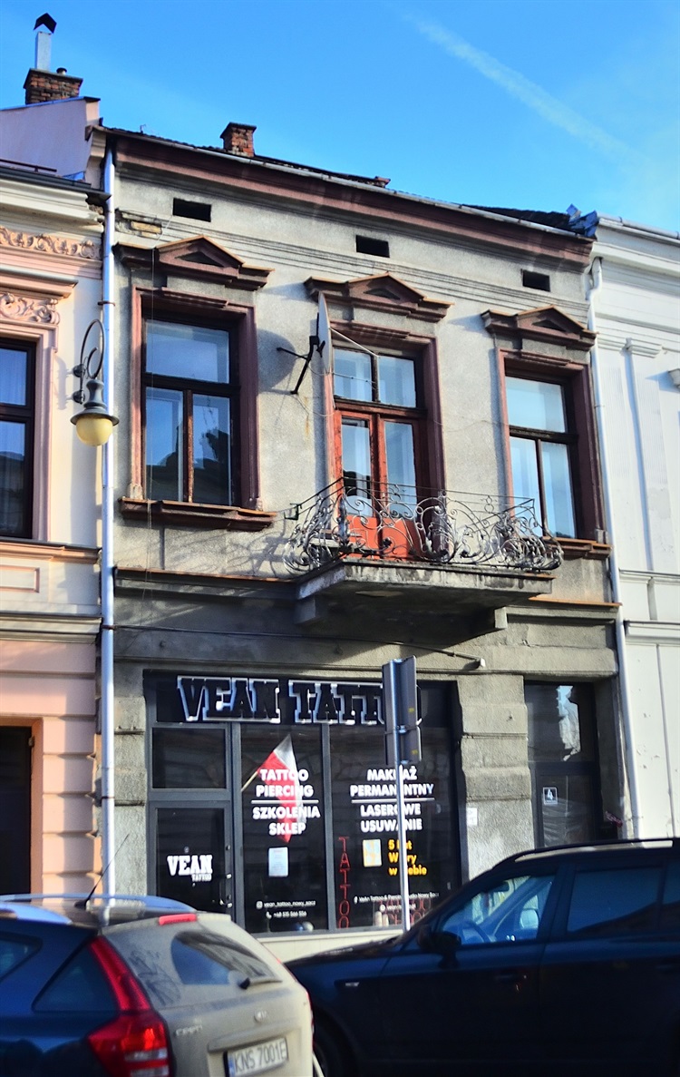 Na piętrze znajdują się trzy okna, z czego środkowe poprzedzone jest balkonem opartym na betonowych wspornikach i wyposażonym w ozdobną, kutą w metalu balustradę. Nad oknami znajdują się ozdobne, trójkątne przyczółki. Kamienica wpisana jest do gminnej ewidencji zabytków.