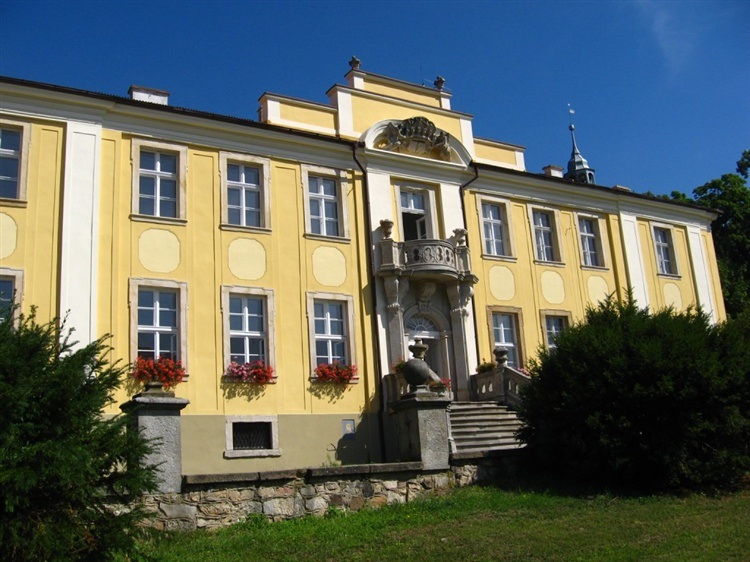 Zespół pałacowy (XVII w.) Dzieje pałacu sciśle związanę są ze średniowiecznym górującym na wzgórzu, z którym do 1945 roku tworzyły jedną całość w postaci wielu budowli z różnych okresów, zbudowanych w różnym stylu architektonicznym. Zespół ten po wojnie nazywany był Wileńskim Gródkiem. Najstarszy z zespołu jest zamek, usytuowany na bazaltowej skale. W XIII wieku w postaci lenna zamek przejmuje Konrad von Zedlitz. Jego potomkowie rozbudowali warownię i dzieki nim od strony południowej powstał dwór.