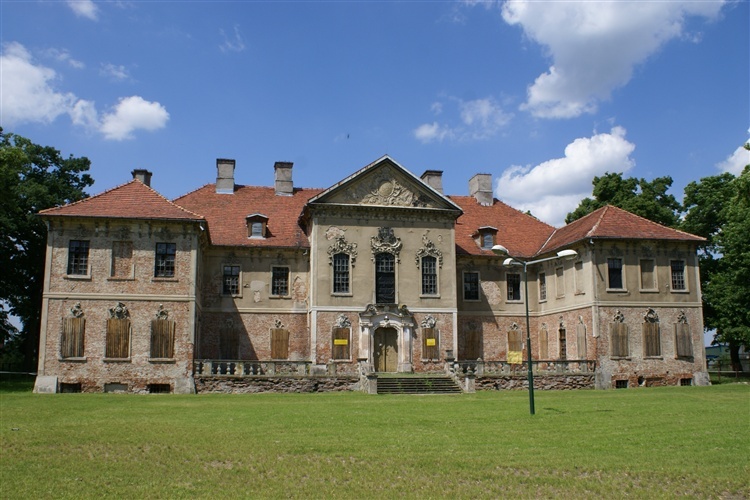 Pałac został wzniesiony w 1731 roku. Odbudowany po pożarze w latach 1734-1735 jako dwukondygnacyjna budowla. Usytuowany jest równolegle do drogi głównej, ogrodzony bramą. Po obu stronach bramy wzniesiono dwie kordegardy. Oficyny wybudowano na początku XIX wieku w stylu klasycystycznym.