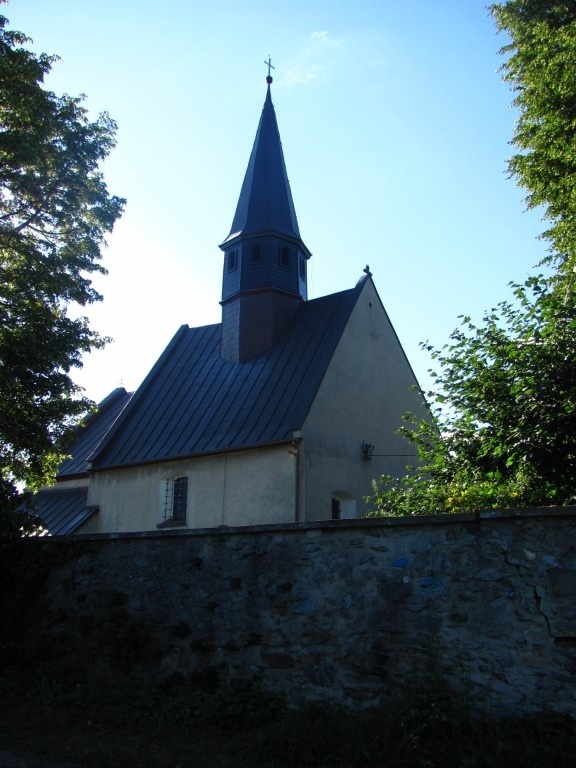 Obecny kamienny kościół wzniesiono w XV wieku na miejscu wcześniejszej romańskiej świątyni z XIII w. Kościół jest jednonawowy. Nad korpusem nawy umieszczono ośmioboczną sygnaturkę nakrytą hełmem w kształcie iglicy.(madzikmb)