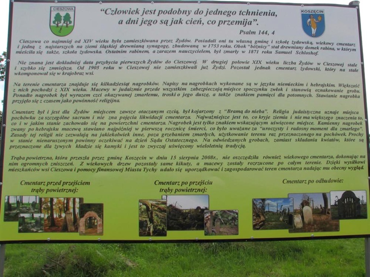 W 2008 r. trąba powietrzna dokonała poważnych zniszczeń wiekowych drzew, rosnących na tym cmentarzu. Został on założony w II poł. XVII w., a najstarsza z zachowanych ok. 100 macew datowana jest na rok 1780. Nagrobki posiadają dwujęzyczne inskrypcje po hebrajsku i po niemiecku.