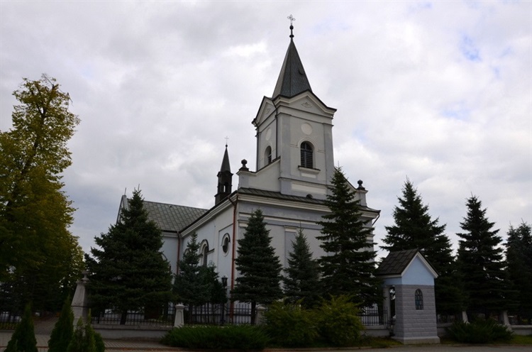 Świątynię konsekrowano w 1854 r. Teren kościoła, na którym oprócz drewnianej dzwonnicy postawiony został również pomnik papieża Jana Pawła II otoczony jest ogrodzeniem z pięcioma kapliczkami. Na słupkach łącznikowych poszczególne elementy metalowego ogrodzenia umieszczone zostały figury świętych.