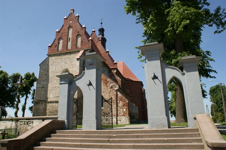 Prezbiterium, zakrystia i część nawy pochodzą z XIV i XV wieku, część zachodnia kościoła neogotycka pochodzi z połowy XIX wieku. Na południowej ścianie pomiędzy prezbiterium a nawą zachowała się gotycka wieżyczka ze strzelniczymi otworami, co może świadczyć, że kościół pełnił również funkcję obronną. Cztery dzwony ufundowane w 1939 roku w 25 rocznicę walk I Pułku Piechoty Legionów Polskich nad Nidą zawieszono w przykościelnej murowanej dzwonnicy. Każdego roku 6 grudnia w święto patrona kościoła odbywają się tu uroczystości odpustowe.