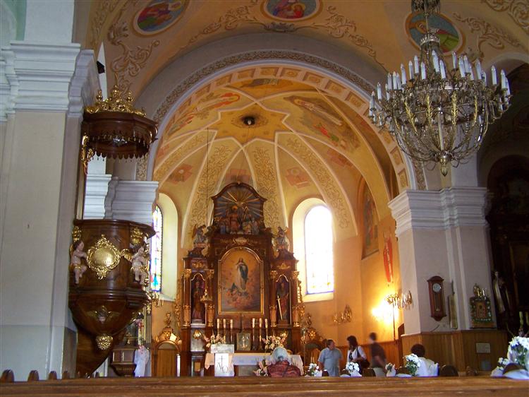 Obecny kościół posiada polichromię z lat 80. XX w., która zastąpiła wcześniejsze malowidła z lat 40. XX w. Jego ołtarz główny nosi cechy neobarokowe, podobnie jak ambona z rzeźbami trzech aniołów. Do wyposażenia świątyni należą m.in. kielich z XVIII w. oraz monstrancja z 1854 r. Przy wejściu do niej widnieją dwie tablice. Pierwsza z nich dedykowana jest pamięci kpt. Jerzego Kurpińskiego, dowódcy oddziału AK "Ponury”. Natomiast druga - księdzu Leonowi Kuchcie i organiście Władysławowi Misterkowi, którzy zginęli z rąk Niemców podczas II wojny światowej.