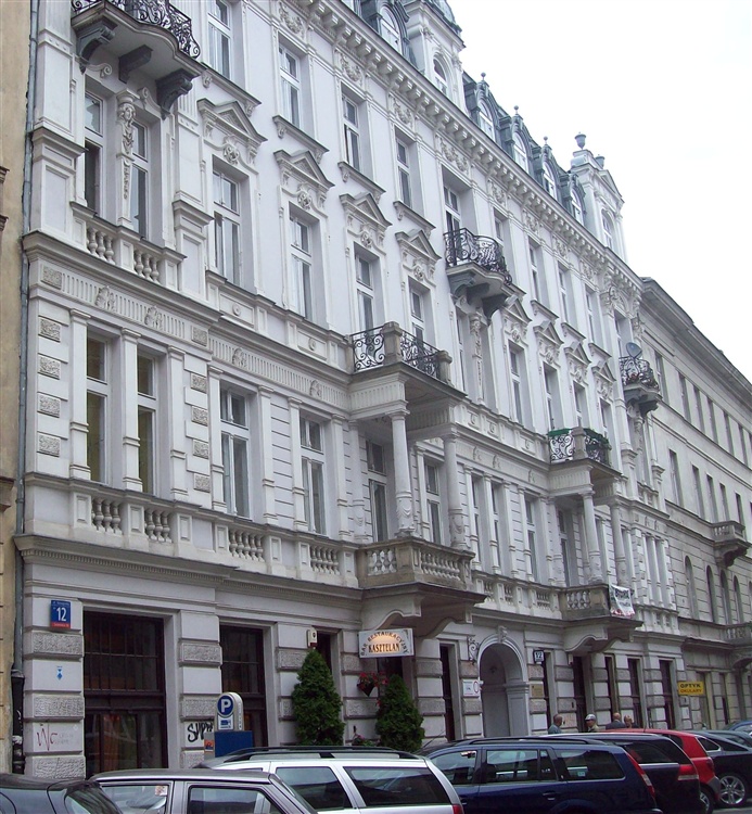 Jest kamienicą frontową, trzypiętrową z poddaszem mieszkalnym. Wyróżnia się bardzo ciekawą elewacją, min. w środkowej części nad oknem poddasza znajduje się attyka, a całość zwieńczona jest hełmem czterołupinowym w formie biretu. Warto zwrócić uwagę na balkony, które w narożach balustrad posiadają dwie kolumny i dwie półkolumny, które wspierają dwa balkony z wyższego piętra. Przepiękne są również balkony z rzeźbionymi żeliwnymi balustradami.