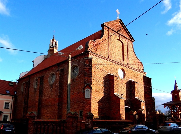 Z kościołem sąsiadują budynki klasztoru, po którego ogrodach chadzają strusie. U podnóża skarpy kościelnej – ciekawy pomnik Jana Pawła II.