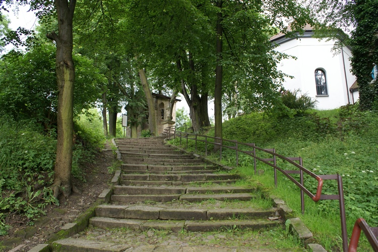 Kamienne schody od 1907 r. prowadzą na wzgórze staromiejskie do Kościoła św. Jana Chrzciciela. Po prawej stronie schodów znajduje się cmentarz Jeleniec oraz lipa "Marysieńka" upamiętniająca zwycięstwo pod Wiedniem w 1683 r. (w niszy lipy umieszczona została figura N.P.M. Niepokalanie Poczętej). Na szczycie schodów usytuowane zostały dwie kamienne figury z 1768 r. przedstawiające św. Jana Nepomucena oraz Najświętszą Marię Pannę. Rzeźby te stały niegdyś przy moście na rzece Rabie. Podczas II wojny światowej zostały zrzucone przez Niemców do rzeki. Wydobyte przez mieszkańców w 1970 r. zostały przeniesione w obecne miejsce.