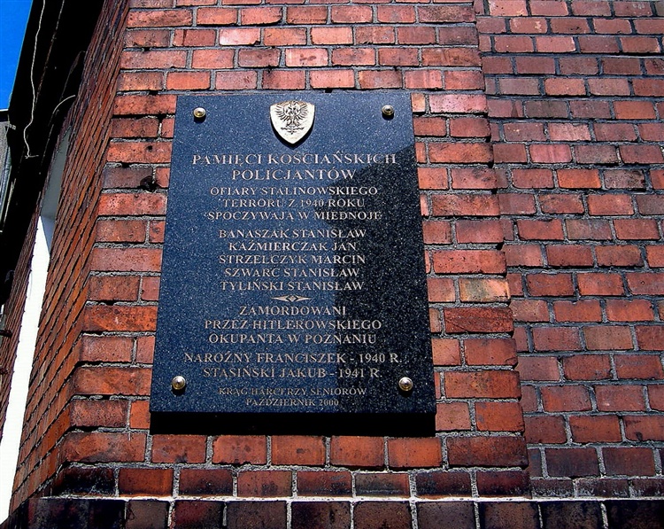 Kościańscy policjanci złożyli ofiarę życia w czasie II wojny światowej. Pięciu z nich zostało zamordowanych przez NKMD w lesie pod Miednoje w 1940 r. Dwóch następnych zabili hitlerowcy w Poznaniu w latach 1940 i 1941. Dziś na dawnym budynku policyjnym, u zbiegu ulic Targowej i Strzeleckiej, widnieje pamiątkowa tablica ku ich czci.