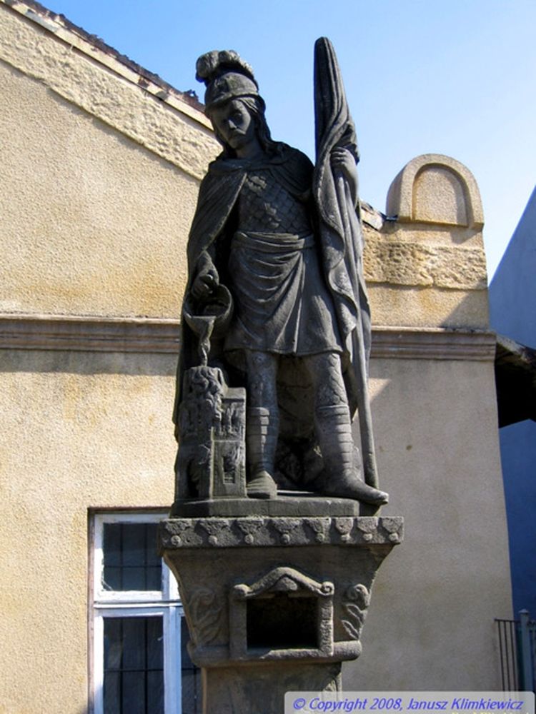 Figura św. Floriana z 1780 r. stoi przed 200-letnim domem zbud. z cegły, drewna i kamienia. W domu tym dawniej mieściła się "rotmistrzówka".