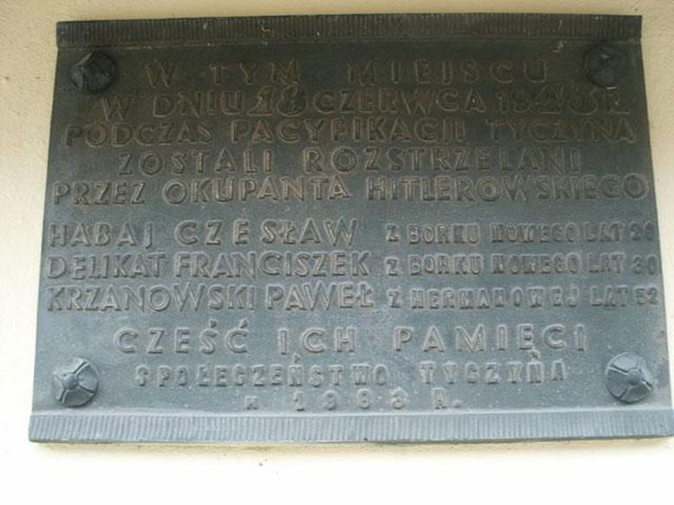 Tablica na kościelnym murze przy ulicy Strażackiej upamiętnia pacyfikację Tyczyna w dniu 18 czerwca 1943 r. Zostali wówczas rozstrzelani przez okupanta hitlerowskiego Czesław Habaj z Borku Starego i Franciszek Delikat z Borku Nowego oraz Paweł Krzanowski z Hermanowej. Tablicę ufundowało społeczeństwo Tyczyna w 1983 r.