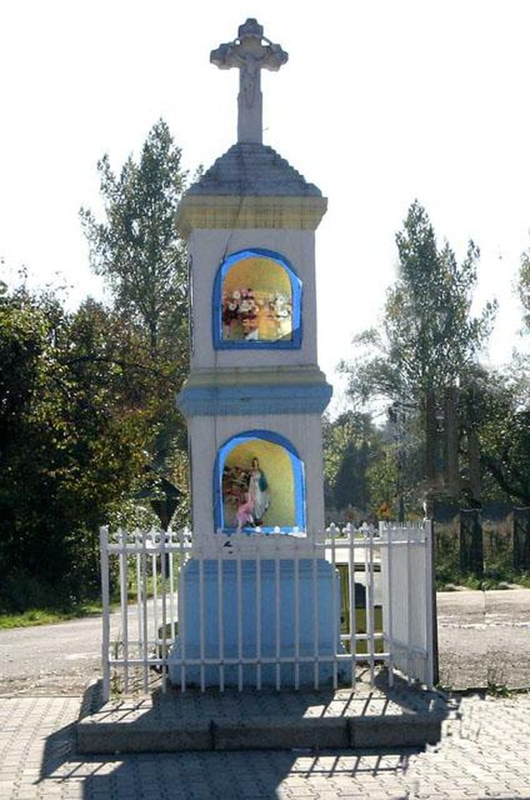 Figura-kapliczka wzniesiona w 1882 r. Dwukondygnacyjna, posadowiona na wysokim cokole, na którym wykuto inskrypcję: "Fundatorowie - Paweł i Katarzyna Jopkowie. 1882". Bryła kapliczki jest podzielona profilowanymi gzymsami i zwieńczona ozdobnym, wykutym w kamieniu krzyżem z figurą Chrystusa. W obu kondygnacjach umieszczono otwarte z trzech stron wnęki, sklepione półkoliście (obecnie przeszklone). Znajdują się w nich nowsze gipsowe figurki Matki Boskiej Niepokalanie Poczętej i Jezusa Chrystusa. Zabytek otoczony jest kutym, metalowym płotkiem.