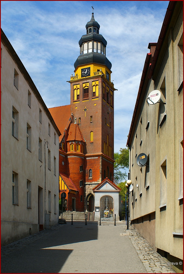 XIII wieczna lokacja miasta wymusiła budowę kościoła farnego tuż przy Rynku. Drewniany kościół otaczał mur, a w jego obrębie znajdował się parafialny cmentarz. W pierwszej połowie XVI wieku przystąpiono do budowy murowanego kościoła, stopniowo dokonując rozbiórki istniejącej świątyni drewnianej. Budowę nowego kościoła rozpoczęto od wieży. Trój kondygnacyjna stanowiła dodatkową śródmiejską fortalicję obronną, co było uzasadnione ówczesnymi walkami o Wodzisławskie Państwo Stanowe. W XIX wieku pożar miasta spowodował również znaczne zniszczenia kościoła. O budowę obecnej świątyni wystarał się proboszcz Henryk Weltike. Neogotycki kościół wybudowany został w/g wrocławskiego architekta Ludwiga Schneidera.