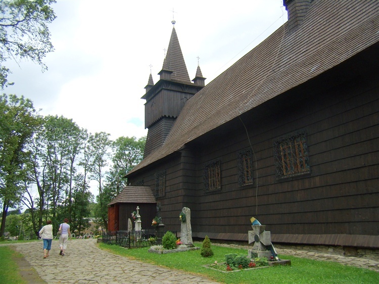 Drewniany kościół jest budowlą orientowaną, jednonawową z mniejszym trójbocznym prezbiterium, do którego przylega boczna zakrystia. Wejście do kościoła wiedzie przez kwadratową wieżę we frontowej ścianie. Podczas remontu kościoła w roku 1901 wydłużono nawę świątyni, wbudowując w nią wieżę w celu wzmocnienia jej konstrukcji. Wieżę wieńczy nadwieszona izbica, której naroża zdobią sterczyny w kształcie małych wieżyczek a nad całością góruje ostrosłupowy hełm z latarnią. Dwuspadowy dach świątyni z wieżyczką na sygnaturkę kryty jest gontem.
