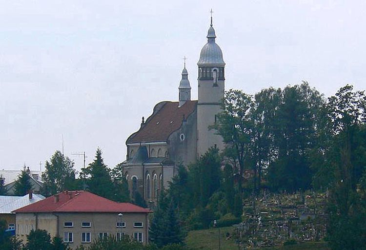 Obiekt usytuowany na wzgórzu frysztackim stanowi główną dominantę panoramy miasta. Wzniesiony został w latach 1924-1927 w miejscu rozebranej świątyni drewnianej z 1442 r. Kościół wybudowano na planie prostokąta, z półkolistą apsydą oraz zakrystią i skarbczykiem od strony południowo-wschodniej. Od strony północno-zachodniej świątynia posiada trzykondygnacyjną wieżę nakrytą smukłym hełmem w kształcie szyszaka, z latarnią.