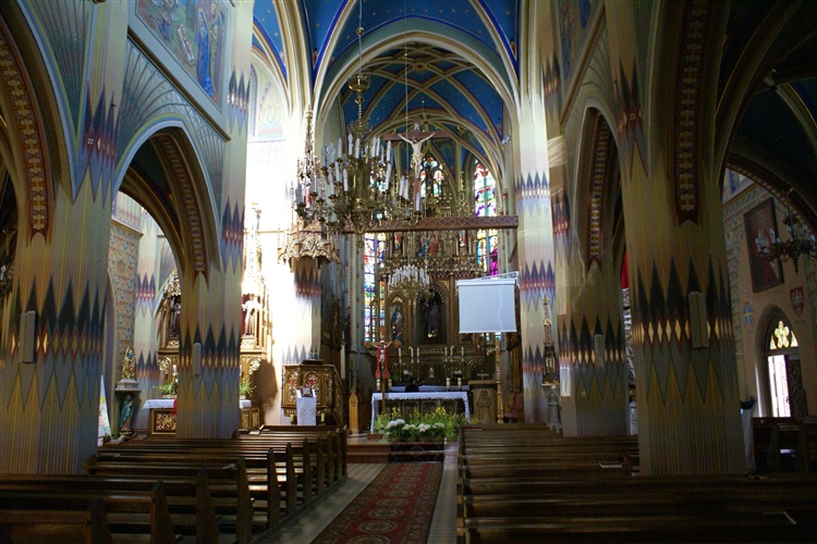 Kościół zbudowany jest w formie trójnawowej z transeptem. Neogotycki ołtarz główny zawiera figurę św. Józefa pomiędzy figurami św. Piotra i św. Pawła, w antepedium umieszczono polichromowaną płaskorzeźbę Ostatniej Wieczerzy. Świątynię zdobią polichromie ze scenami z życia Marii oraz wzorów geometrycznych zaś sklepienie gwiaździstym nieboskłonem. Okna wypełniają witraże z wizerunkami świętych. Ołtarze boczne oraz ambona wykonane są w stylu nawiązującym do gotyckiego z licznymi niszami i złoconymi kolumienkami.