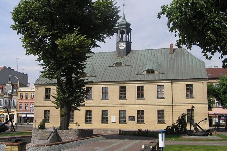Pierwszy ratusz miejski budowany był w latach 1805-1806 według projektu mistrza budowlanego Manera jako siedziba wielu instytucji miejskich. Wieżyczkę z zegarem dobudowano w 1836 r. W latach 1932-1945 zabytek ten mieścił muzeum regionalne oraz miejską kasę oszczędnościową. Po II wojnie światowej do 1973 r. budynek był ponownie siedziba władz miasta. Od jesienią 1974 r. swoją siedzibę ma tutaj Muzeum Rybołówstwa Morskiego, które warto zobaczyć.