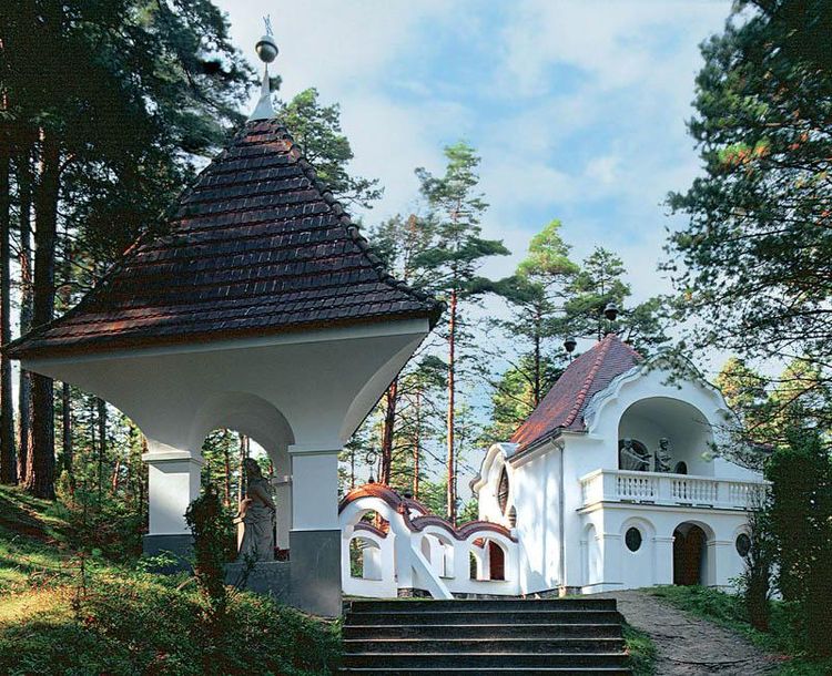 Kalwaryjska ścieżka zaczyna się przy kościele parafialnym, po czym wzdłuż brzegu Jeziora Wielewskiego podąża na Białą Górę, która w mistycznej topografii tego miejsca jest jednocześnie Góra Oliwną, Górą Syjon i Golgotą. Większość kaplic ma formy secesyjne. Co ciekawe, najstarsze z nich zostały zaprojektowane i ozdobione głównie przez artystów niemieckich z Monachium, Berlina i Lipska. Najbardziej okazałym elementem kalwarii jest kościół Ukrzyżowania z ciekawą amboną w kształcie kielicha kwiatu i witrażami, na których przedstawiono herby fundatorów.