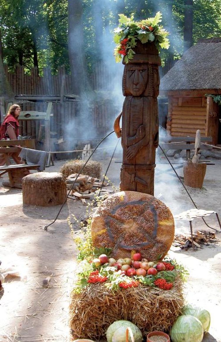 Oprócz bramy i wału jest tutaj również kilka drewnianych chat i szop krytych strzechą, które zbudowano dokładnie w tych samych miejscach, gdzie ich ślady zostały odkryte przez archeologów. W jednej z zagród pobekują kozy, na środku majdanu pali się ognisko, a przy nim stoi drewniany posąg jakiegoś słowiańskiego bóstwa o wielu twarzach.