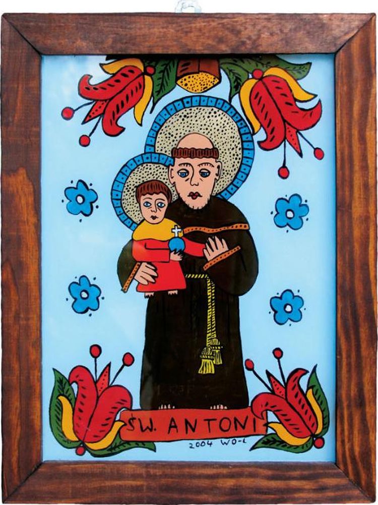 Pan Włodzimierz Ostoja-Lniski na szkle maluje od niedawna. Choć nie uczestniczył w warsztatach dla twórców (jest samoukiem), jego malowani na szkle święci otoczeni kaszubskimi motywami roślinnymi zachwycają przedstawieniem i bogactwem barw.