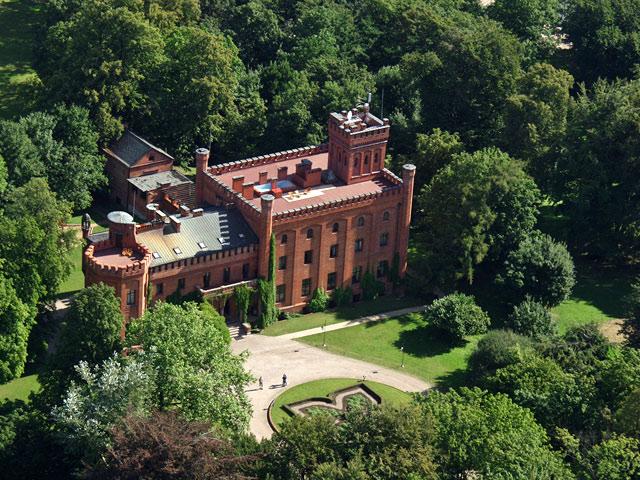 Projektantem gmachu w stylu neogotyku angielskiego był berliński architekt August Stüler. Powstały wówczas także inne budynki, m.in. dom zarządcy, pomieszczenia gospodarcze i kaplica grobowa właścicieli. Pałac otoczony jest parkiem krajobrazowym z pomnikowymi okazami dębów, grabów, lip, platanów i kasztanowców jadalnych. Prowadząca do posiadłości aleja lipowa pochodzi z XVII w.