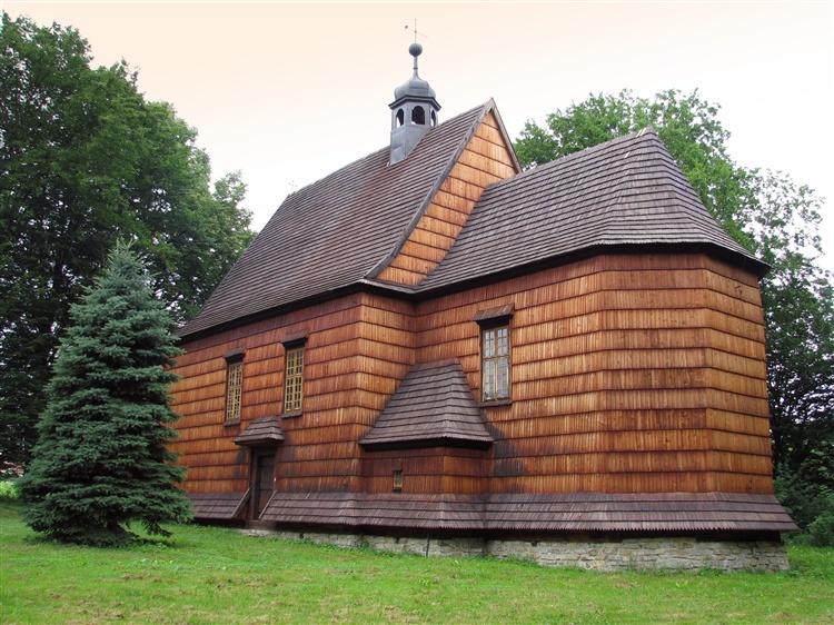 Modrzewiowy barokowy kościół św. Katarzyny (1760-1763) z polichromią.