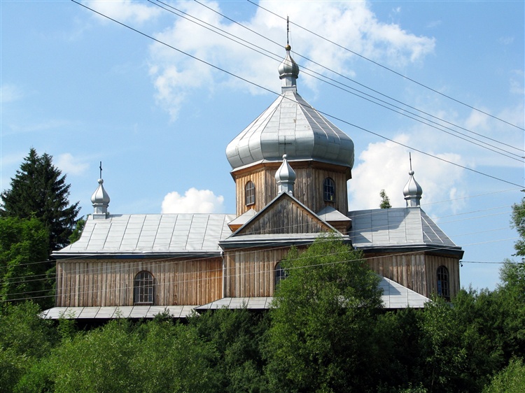 Cerkiew wzniesiona na planie krzyża z jedną kopułą na przecięciu nawy i transeptu swoją bryłą nawiązuje do narodowego stylu ukraińskiego. Świątynię nakrywają dwuspadowe dachy z ozdobnymi kopułkami na szczytach naw. Wokół cerkwi przebiega okapowy daszek.