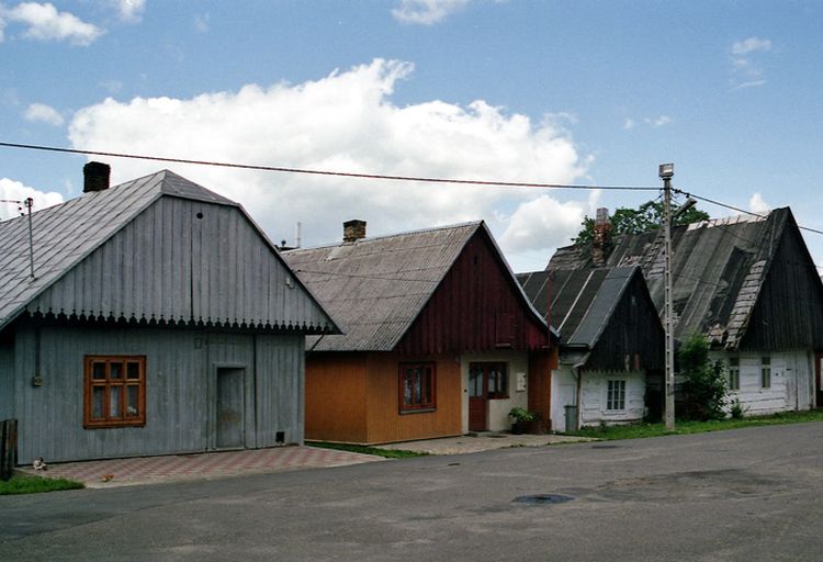 Dawny rynek i zabudowa małomiasteczkowa - drewniane domy ustawione szczytami do ulicy (XIX w.).