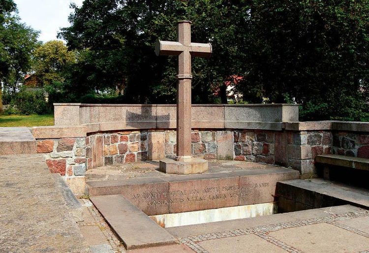 Architekt Karol Fryderyk Schinkel zaprojektował pomnik, wzorując się na rzymskim baptysterium cesarza Konstantyna Wielkiego. Uwagi do projektu poczynił także następca tronu, Fryderyk Wilhelm (czwarty z kolei Fryderyk Wilhelm wśród koronowanych Hohenzollernów). W czasie obchodów 700-lecia chrztu pierwszych Pomorzan młody Fryderyk wmurował kamień węgielny pod budowę pomnika, który wzniesiono w 1825 r. Znajdującemu się tutaj Świętemu Źródłu nadano formę basenu. Tuż koło niego wzniesiono krzyż z polerowanego granitu, a całość otoczono kamiennym murem.