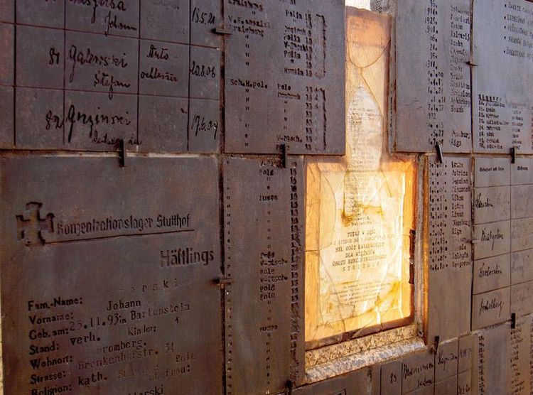 Miejsca związane z Marszem Śmierci upamiętnia kilkadziesiąt pomników. Większość z nich to skromne krzyże, kamienie i płyty pamiątkowe. Do ciekawszych należy pomnik wystawiony w 2001 r. na miejscu obozu w Gęsi, usytuowany ok. 2 km na zachód od drogi Lębork - Łeba, na skraju doliny rzeki Łeby. Pomnik ten ma formę prostokątnej ściany obłożonej metalowymi płytami, które wystylizowano na kartki z obozowej kartoteki. Rzędy nazwisk, beznamiętne rubryki urzędowych formularzy, smętny krajobraz w tle - przy minimum środków artystycznych uzyskano efekt, który zmusza do zadumy nad tragicznymi losami tysięcy więźniów Stutthofu, którzy zginęli w tej okolicy na kilka czy kilkanaście dni przed wyzwoleniem.