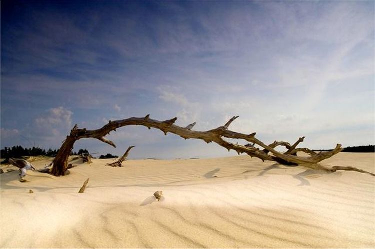 Największą atrakcją turystyczną parku są właśnie wędrujące wydmy, ich wysokość przekracza 40 m. Ruchome piaski bezlitośnie zasypują lasy i łąki. Częstym widokiem są kikuty przysypanych drzew, niekiedy przesuwająca się wydma odsłania fragmenty budowli niemieckiego poligonu lub drewniane szczątki chałup zasypanych niegdyś wsi. Najwyższa z ruchomych wydm - Góra Łącka - kryje ponoć osadę Łączki, która przez wędrujące piaski została zasypana w XVIII w. Wydmy parku na planie filmu Faraon Jerzego Kawalerowicza wystąpiły w roli afrykańskiej pustyni.