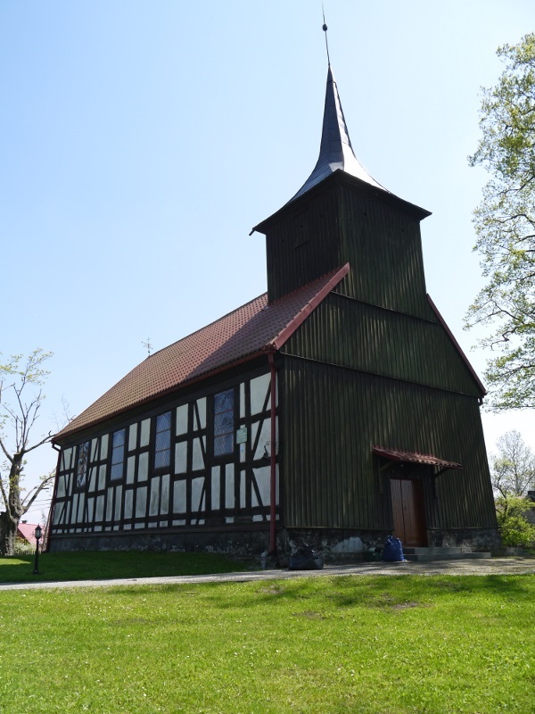 Budynek jest orientowany, ma konstrukcję ryglową. Ściana zachodnia wraz z wieżą obłożona jest okładziną z desek. Ostatnia wojna oraz powojenny remont zniszczyły pierwotny wystrój świątyni. Na uwagę zasługuje znajdujący się w ołtarzu obraz olejny na płótnie z XVIII w. przedstawiający scenę ukrzyżowania Chrystusa oraz chrzcielnica, przeniesiona tu z kościoła w Łebuni. Poza tym warto zwrócić uwagę na dwie nagrobne płyty (przed ołtarzem) poświęcone fundatorowi kościoła Ernestowi von Weiherowi oraz innemu przedstawicielowi rodu Weiher - Franciszkowi Jerzemu. Witraże w oknach są dziełem współczesnych twórców.