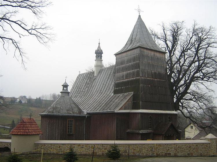 Drewniany kościół (1520, przebudowywany) o konstrukcji zrębowej. W jego wnętrzu znajduje się 5 ołtarzy, późnobarokowa ambona z XVIII w., chrzcielnica kamienna z XVI w. i organy ośmiogłosowe z 1897 roku. Kościół należy do Szlaku Architektury Drewnianej w Małopolsce.