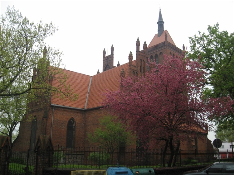 Świątynia gotycka pochodzi z 1248 r., została wybudowana z cegły i polnych kamieni. Kościół jest orientowany, tzn. ma prezbiterium zwrócone ku wschodowi. Na szczycie czterospadowego dachu kościelnej wieży znajduje się latarnia zwieńczona iglicą. Wnętrze kościoła ma układ pseudobazyliki (brak okien w nawie głównej). Z zabytkowego wyposażenia warto zobaczyć m.in.: manierystyczny ołtarz główny, ufundowany przez ówczesnego burmistrza Żuław, średniowieczną granitową kropielnicę, obraz Pokłon trzech króli z przełomu XVII i XVIII w. prawdopodobnie pędzla Luca Giordano, zawieszone na wieży trzy stalowe dzwony z 1918 i 1919 r. oraz wmurowane w ściany płyty nagrobne z 1696 i 1718 r. W latach 1827-1945 kościół służył ewangelikom jako zbór.