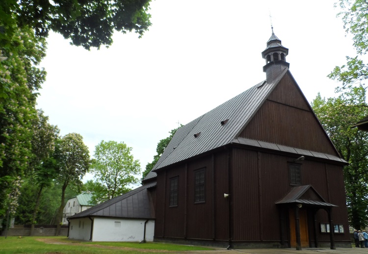 Świątynia orientowana, konstrukcji zrębowej wzmocnionej lisicami, zewnątrz oszalowana. Nawa na rzucie zbliżonym do kwadratu, prezbiterium węższe, zamknięte trójbocznie. Przy nim od północy murowane zakrystia i skarbczyk. Nad nawą oraz nad składzikami oddzielne dachy dwuspadowe, nad prezbiterium trzyspadowy. Przed wejściem głównym daszek dwuspadowy wsparty na dwóch słupach. Wszystkie dachy kryte blachą. Ośmioboczna, ażurowa wieżyczka na sygnaturkę ze stożkowym hełmem ze sterczyną, umieszczona nad szczytem fasady.