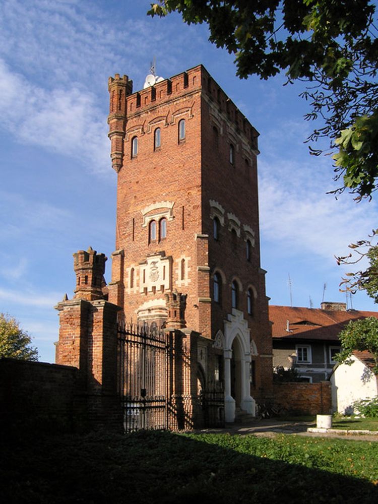 Neogotycka wieża wodociągowa (XIX w.).