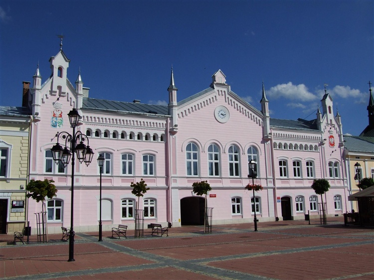 Budynek był wielokrotnie przebudowywany. Na frontowej elewacji na środku znajduje się zegar. Po bokach herb miejski oraz godło państwowe. Warto dodać, że ratusz powstał na miejscu dwóch poprzednich. Były to budynki drewniane. Jeden splonął w 1756 r. Drugi spalil się również w 1782 r.