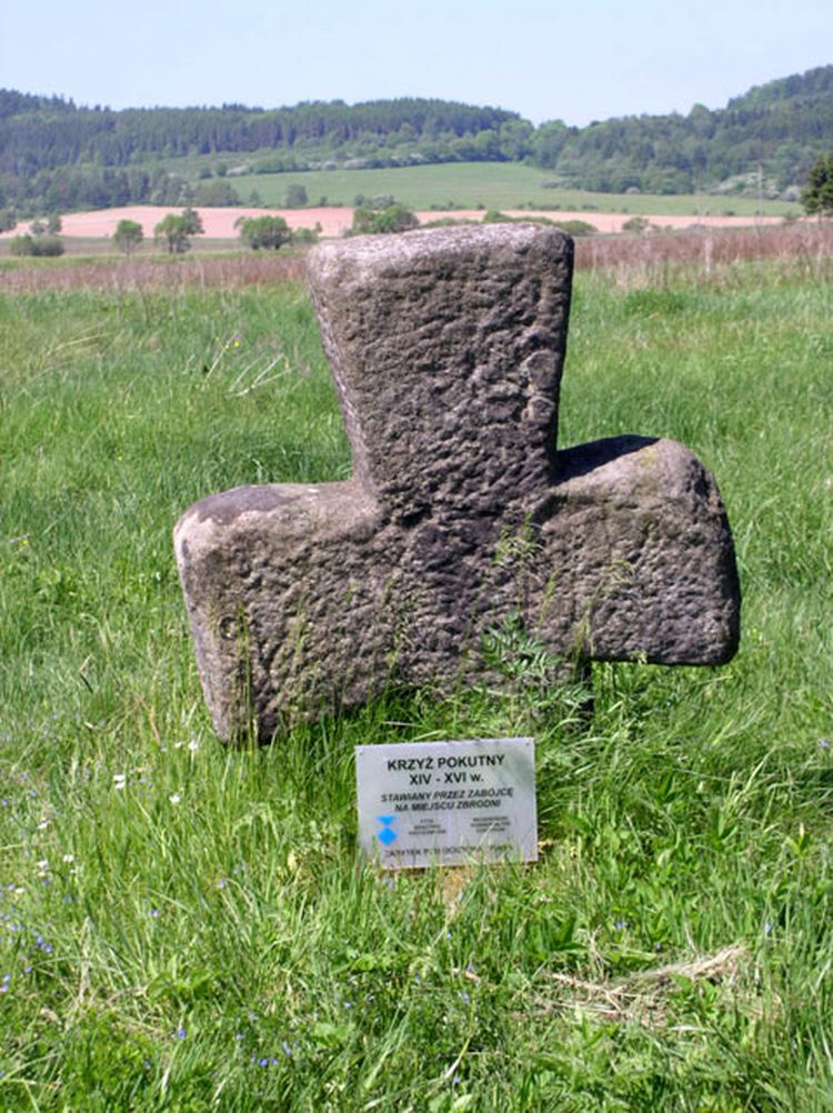 Prawo średniowieczne nakładało na zabójcę m.in. pokutę osobistą: miał on bowiem obowiązek wykucia w kamieniu krzyża lub postawienia kapliczki. Na krzyżach pokutnych często było przedstawione narzędzie zbrodni (miecz, nóż, topór itp.). Stawiano je ku przestrodze, nie tylko w miejscach, gdzie popełniono zbrodnie, ale także tam, gdzie często pojawiały się duże grupy ludzi, np. w okolicy kościołów, przy skrzyżowaniach ważniejszych dróg itp. Na Dolnym Śląsku zachowało się wiele takich kamiennych krzyży pokutnych, a w granicach gminy Kamienna Góra do chwili obecnej jest ich 8 (w Raszowie, Szarocinie, dwa w Krzeszowie, w Krzeszówku, Gorzeszowie, Kochanowie i w Pisarzowicach). To osobliwa atrakcja i pamiątka po dawnym zwyczaju.