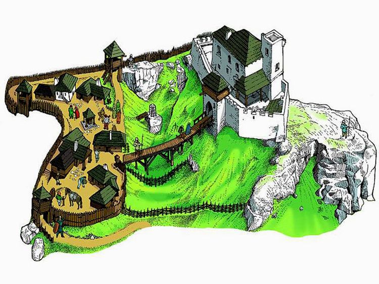 Zamek był, jak na owe czasy, bardzo obszerny. Składał się z zamku dolnego i górnego, oddzielonych od siebie głęboką fosą wypełnioną wodą, doprowadzaną z górnego, nieczynnego już dzisiaj źródła. W południowej części wznosiła się wystająca na zewnątrz murów czworokątna baszta o wymiarach 6 x 9 m (widoczna jeszcze dzisiaj), pod którą znajdowały się podziemia, obecnie zasypane. Od strony południowej stok wzgórza opada do głębokiej fosy. Poza nią znajdował się zamek dolny o pow. ok. 7200 m². Prowadzone badania ujawniły przygotowany do budowy, usypany w sterty kamień wapienny oraz ceramikę i monety z okresu Cesarstwa Rzymskiego.