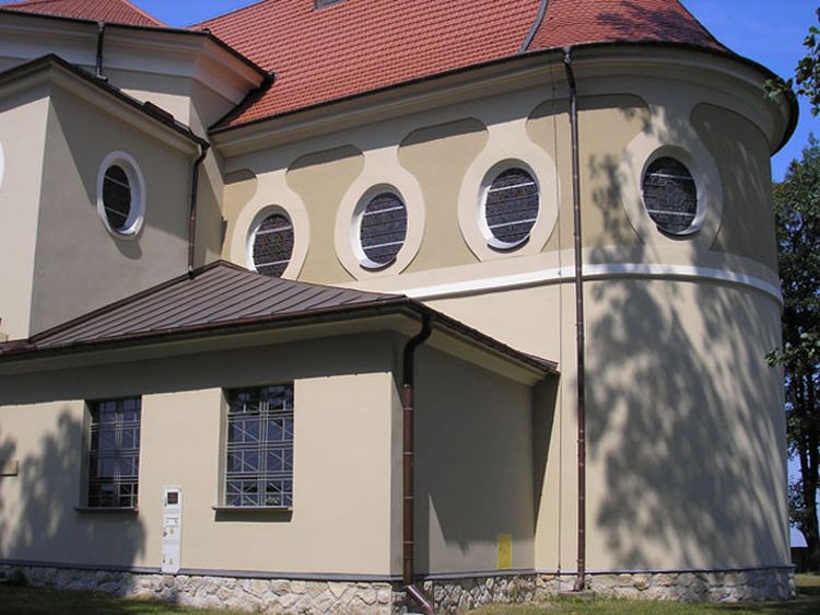 Pierwszy, drewniany kościół istniał tu prawdopodobnie już na przełomu XIII i XIV w. Obecną świątynię wybudowano w 1924 r. Dzięki ciekawej formie i bardzo wysokiej wieży – 40 m, obiekt wyróżnia się w okolicy. W jego wnętrzu warto zobaczyć m.in. portret króla Jana III Sobieskiego (XVIII w.), obraz Przemienienia Pańskiego (XVII w.) oraz posąg św. Jana Chrzciciela (XV w.).