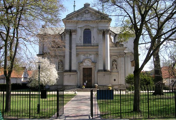 Mnisi zostali tu sprowadzeni z Bielan pod Krakowem w 1639 r. przez króla Władysława IV. Początkowo postawili drewnianą kaplicę, a w roku 1670 zaczęli wznosić obecny kościół. Jest to najpiękniejsza budowla barokowa w północnej części Warszawy. Świątynia ma nawę na planie elipsy i sześć kaplic. Do wydłużonego prezbiterium (jak zwykle w kościołach klasztornych) przylegają zakrystia i kapitularz. Wnętrze jest całkiem białe, zdobi je tylko rokokowa sztukateria. Po obu stronach prezbiterium znajdują się malowane na blasze portrety fundatorów kościoła: po prawej króla Jana Kazimierza i starosty nurskiego J. K. Brzezińskiego, a po lewej - Władysława IV i Michała Korybuta Wiśniowieckiego.