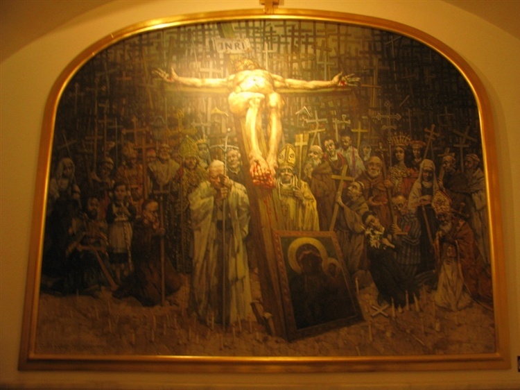 Na górnej kondygnacji wejściowej części kaplicy Matki Bożej, tzw. Przybudówki, prezentowanych jest osiemnaście dużych obrazów Jerzego Dudy-Gracza, wprowadzających widzów w krąg niepokojów współczesności, warto to zobaczyć.
