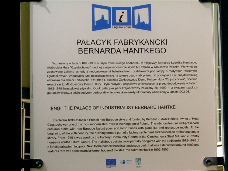 Pałacyk wzniesiony w latach 1900-1903 w dzielnicy Raków przez Bernarda Hantkego, właściciela huty, odznacza się dużą liczbą detali architektonicznych, które warto zobaczyć. Jego bryłę zniekształciły rozbudowy (zwłaszcza ta z lat 1973-1978) i dostawienie od frontu budynku pływalni. Obiekt otacza park krajobrazowy (o powierzchni 2 ha), założony na początku XX w., z okazami rzadkich drzew i krzewów. Obecnie to ciekawe miejsce jest siedzibą Młodzieżowego Domu Kultury.