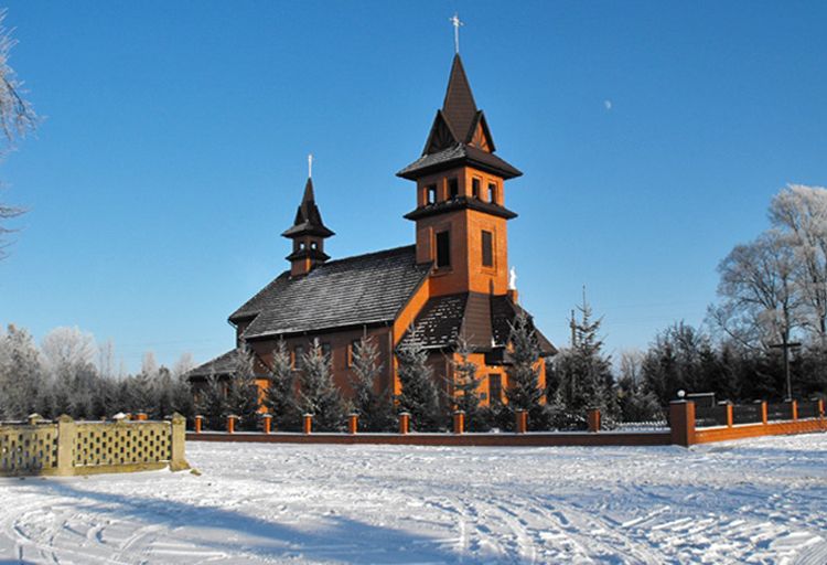 Kościół, który uposażył król August III w 1752 r., w 1875 r. zamieniony został na cerkiew, a w 1918 r. spłonął. Następny drewniany kościół, wzniesiony w latach 1923-1926, rozbudowano w 1937 r. wg projektu Mariana Kiersnowskiego. W latach 1995-2000 wzniesiono tu nową, murowaną świątynię, a stary kościół przeniesiono do prywatnego skansenu-ośrodka wypoczynkowego w Zaborku.