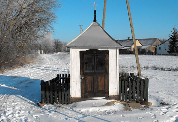 Druga kapliczka, drewniana, konstrukcji słupowej, oszalowana, pochodzi z końca XIX w. Otwór wejściowy jest zamknięty łukiem koszowym, a czterospadowy dach kryty blachą, ma w szczycie drewnianą sterczynę.
