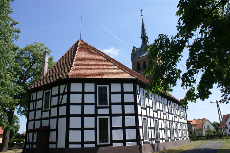 Dawny kościół ewangelicki w Świętnie (szachulcowy z drugiej połowy XIX w., z fasadą i neogotycką wieżą z żółtych cegieł dobudowanymi w 1893 r.) jest dziś świątynią katolicką pw. św. Stanisława Kostki.