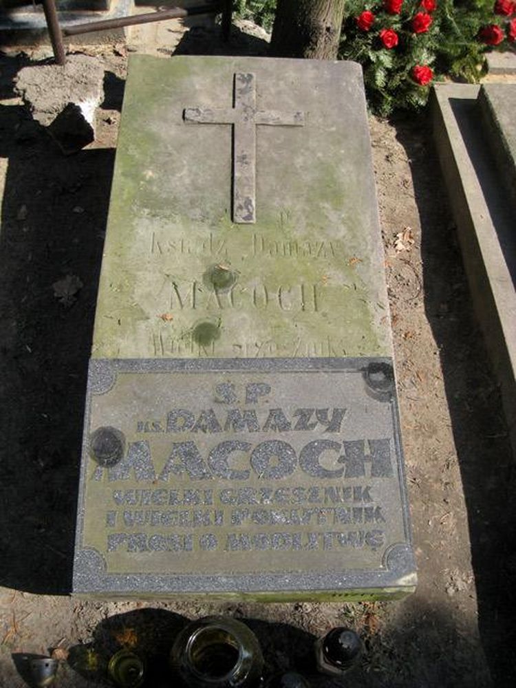 Pośrodku cmentarza położonego na północ od śródmieścia Piotrkowa znajduje się osobliwy grób - stara płyta z piaskowca z nałożoną nań niedawno małą tablicą. Można na nich przeczytać: "śp. ksiądz Damazy Macoch wielki grzesznik i wielki pokutnik prosi o modlitwę". Postać księdza Damazego Macocha, paulina z częstochowskiego sanktuarium na Jasnej Górze, na początku XX w. była znana wszystkim Polakom za sprawą niezwykle poważnej, wręcz wstrząsającej afery kryminalnej.