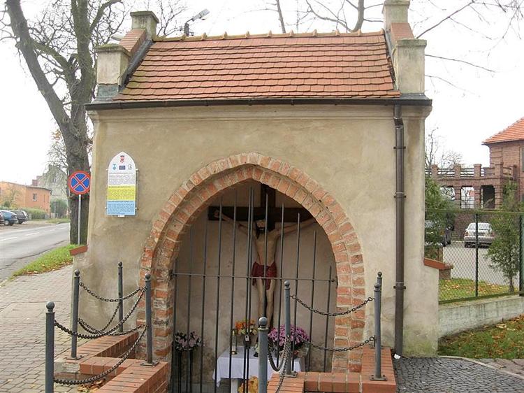 Kapliczka z 1514 r., ceglana, otwarta na zewnątrz arkadą ostrołukową i zamknięta kratą z XIX w. Wewnątrz kopia późnogotyckiego krucyfiksu. Schodzi się do niej po schodkach. Posadzka tej niewielkiej budowli znajduje się sporo poniżej poziomu ulicy.